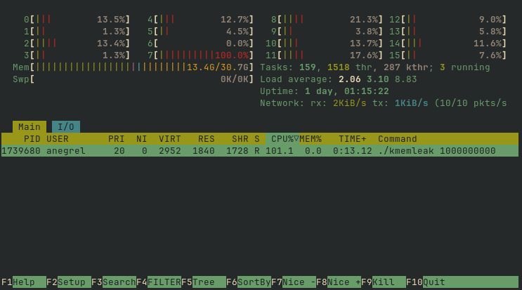 If you run ./kmemleak 1000000000 and observe memory usage in htop, you will